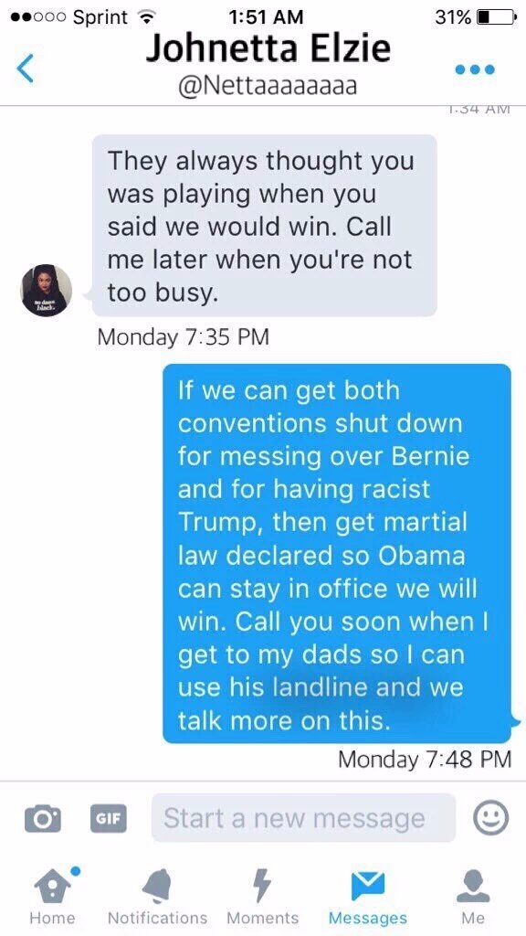Attenzione a questo tweet, che traduco: “Se possiamo far sì che entrambe le conventions vengano chiuse per il pasticcio su Bernie (Sanders) e per il razzista Trump, allora otteniamo la dichiarazione di legge marziale così che Obama resta in carica e noi vinciamo…Dobbiamo assicurare che la gente continui a disturbare [i comizi di] Trump per tutta l’estate e fino all’autunno in modo che la legge marziale sia dichiarata”.