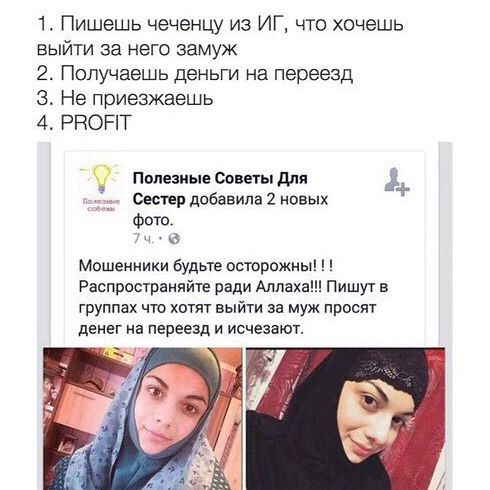 Su certe reti sociali russe sino apparsi messaggi di giovani donne cecene desiderose di aderire allo Stato Islamico; dichiarandosi ardenti dalla voglia di combattere, o ancor più spesso di sposare un combattente per la fede, chiedevano denaro per comprare un biglietto per la Siria. Incredibilmente, molte hanno ricevuto il denaro. Cessando poi di risponde ai messaggi sempre più imperiosi e costernati dei reclutatori di Daesh.