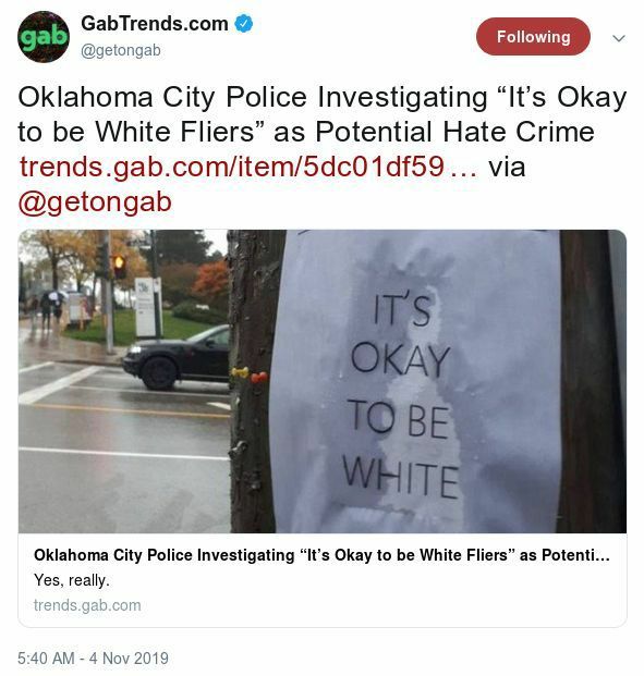 Un manifestino in giro per la città con la scritta: “Essere bianchi è OK”: qualche congiurato l’ha incollato. La polizia di Oklahoma City sta cercando il colpevole, passibile di crimine d’odio.