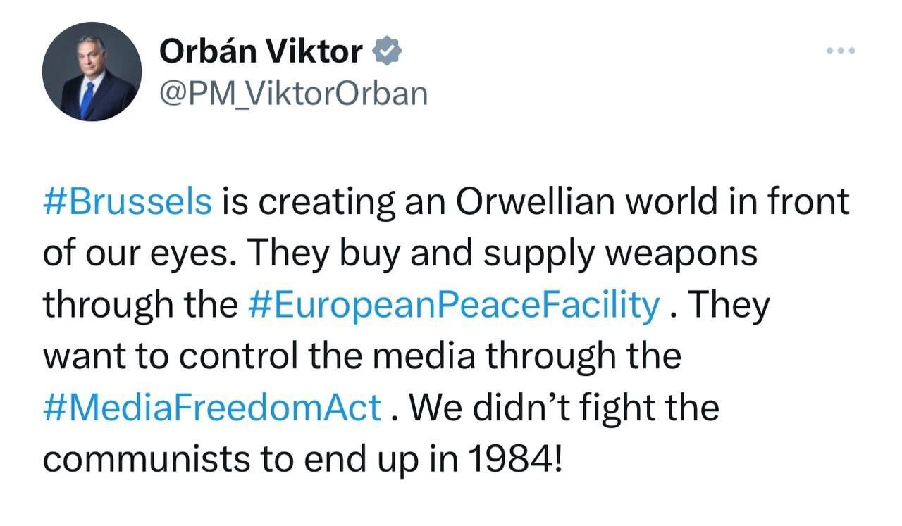 “Bruxelles sta creando davanti ai nostri occhi un mondo orwelliano. Acquistano e forniscono armi attraverso il Fondo europeo per la pace. Vogliono controllare i media attraverso una legge sulla libertà dei media. Non abbiamo combattuto i comunisti per finire nel 1984!”