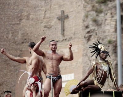 rivendicare rispetto e diritti insultando in modo dissacrante la cristianità ed i suoi simboli più sacri è ormai costume della lobby LGBT. Nella foto: Gay Pride di Roma, partito dalla piazza antistante la Cattedrale di San Giovanni in Laterano sede episcopale del Vescovo di Roma, ed infine giunto in Piazza della Repubblica, già Piazza Esedra, dove si trova l’antica basilica di Santa Maria degli Angeli e dei Martiri, eretta sulle antiche terme di Diocleziano in ricordo dei Martiri uccisi in odio alla fede durante le persecuzioni del III secolo [vedere filmati QUI e QUI]