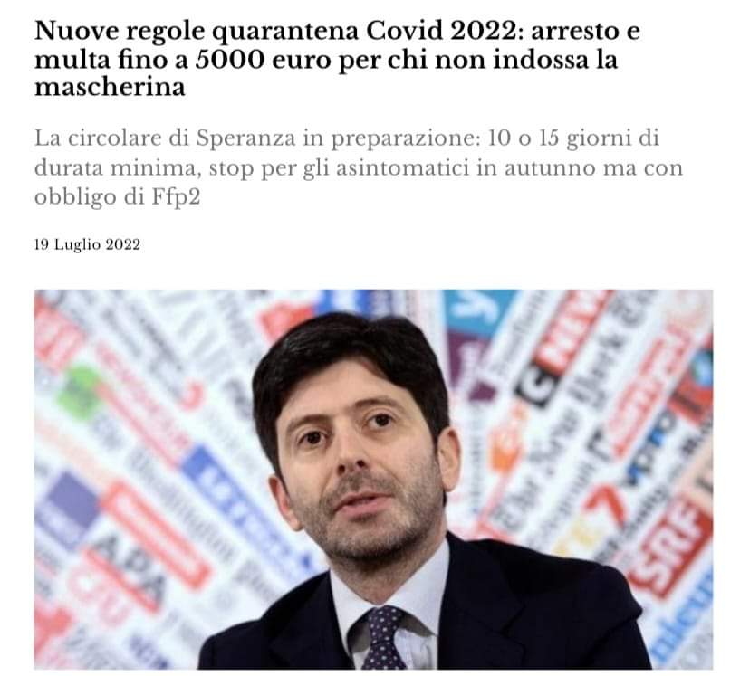 Non è solo che quando la storia si ripete, lo fa come farsa. Naturalmente il fascismo, esercitato su una società vecchia e medicalizzata non ha bisogno di ricorrere al manganello e alle autoblindo per stroncare l’opposizione; basta la circolare di Speranza. Che Speranza ha già preparato: essere un no-vax diventa reato. Si arresterà chi non porta la mascherina, e non lo farà un giudice, ma un sanitario in base a “una circolare” del ministro della sanità