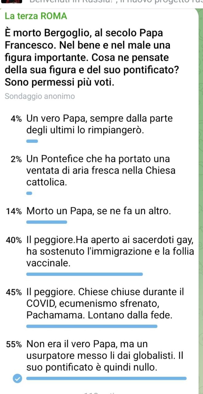 Non è una metafora, né un’esagerazione. È accaduto davvero. Israele Senza Filtri, gruppo Telegram noto per incitamento all’odio e già al centro di un’inchiesta per teorizzazioni di omicidi politici in Europa, ha trasformato la morte di Papa Francesco in una raffica di insulti, sarcasmi velenosi e auguri di dannazione eterna.