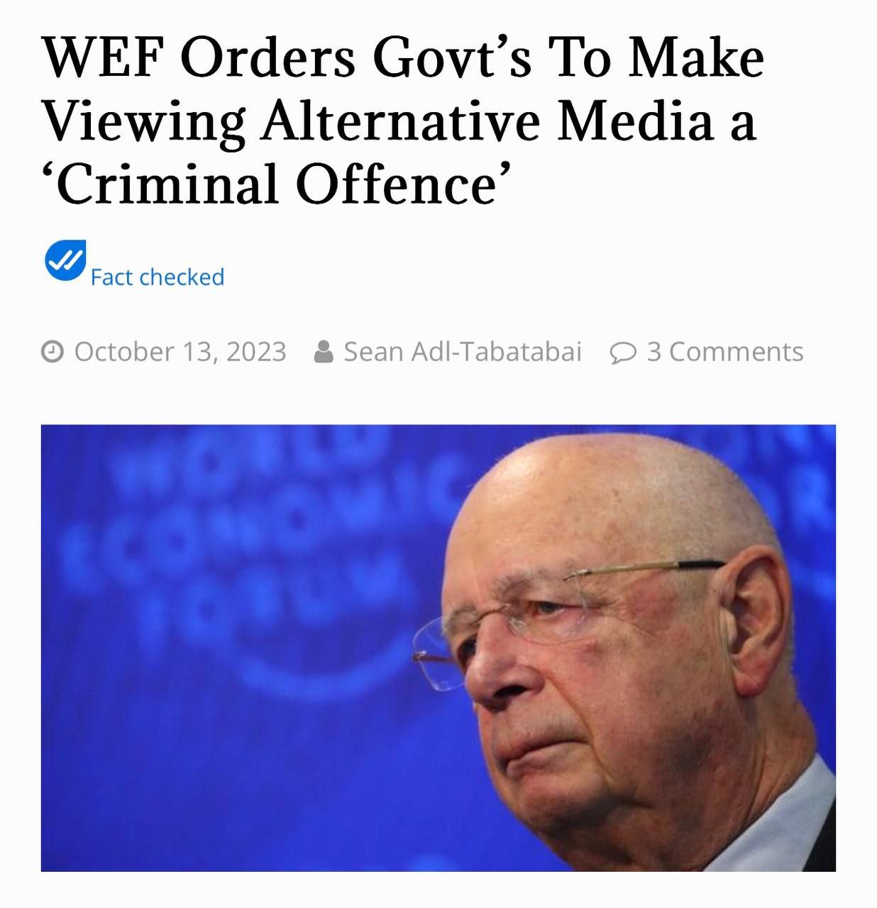 Quindi sopportate le menzogne in tv e consultate i siti come questo, o Messora o Mazzucco e gli altri amici finché anch’esso non verrà chiuso dall’alto: perché la UE sta già per seguire la richiesta del World Economic Forum e fare dell’informazione alternativa un delitto penale (vedi l’articolo sotto)
