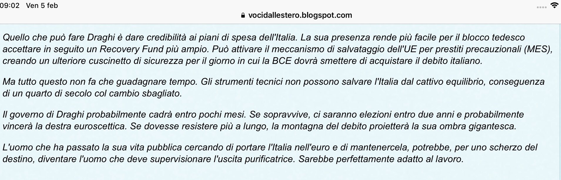 Rispetto al DEGRADO di conte e gualtieri per me sarà in ogni caso un progresso: se Draghi gioca con noi lavorare con lui sarà molto istruttivo e potrebbe essere decisivo. Se gioca contro di noi lo combatterò con la soddisfazione di avere di fronte un nemico vero, non incompetenti.