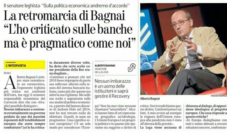 Sacchetti (che qui prendo, senza offesa, solo perché mi è stato girato ed è atteggiamento molto condiviso) “Borghi su Draghi:”è un fuoriclasse. Meglio se gioca con noi”. Ormai siamo alla farsa Draghi è sostenuto da tutto l’establishment mondialista. Siete voi che giocate per lui, non il contrario. Questa comunque è la parabola della Lega di Salvini. Quelli che promettevano l’uscita dall’euro hanno aperto le porte all’uomo dell’euro”.