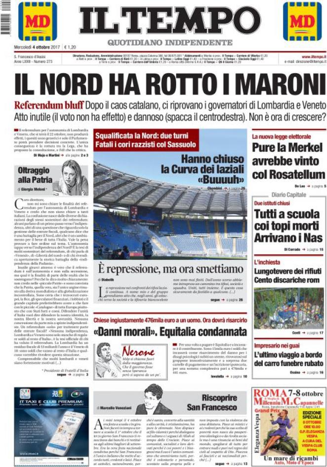 Nobilissimo discorso, ma rivolto   a  pugnalare alla schiena un alleato di governo, senza avvertirlo prima.  Non a  caso Maroni, il governatore di   Lombardia,  tratto fuori la parola “lealtà” .. “Mi riservo di valutare queste osservazioni sul piano della lealtà dell’alleanza di governo”.  Lealtà, che parola  insolita. Pericolosa, pure.  Perché  la Meloni ha scritto su Il Tempo di Roma, l’organo ufficioso delle caste parassitarie romane: quelle che i miliardi   dai lombardo-veneti “li prendono”  per alimentare i loro separatismo particolarismo.  Il partitello della Meloni trova la su forza e tracotanza quando si tratta di difendere quegli interessi. E’ pronta a far saltare l’alleanza con Salvini,  nessuna lealtà la trattiene.  E, benché “fascista” e patriottico, trova alleanze molto potenti nel cosiddetto “arco costituzionale”, quando si  tratta di far continuare il flusso di miliardi (una settantina  l’anno)  verso i fancazzisti,  e le mafie. Il titolo tracotante de Il Tempo parla da sé: