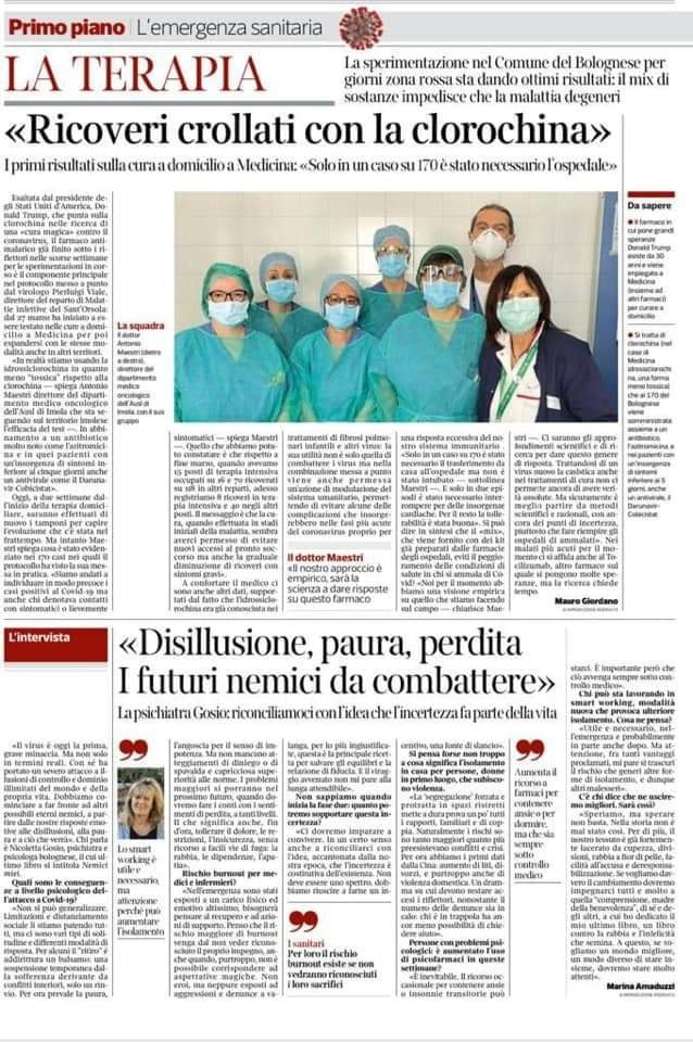 “Sta diventando una malattia curabile a casa”, ciò è confermato anche dalla squadra medica di Medicina (comune presso Bologna) che somministrando la clorochina precocemente, e non dopo il ricovero, riescono a impedire che i pazienti finiscano all’ospedale intubati, per morire-.