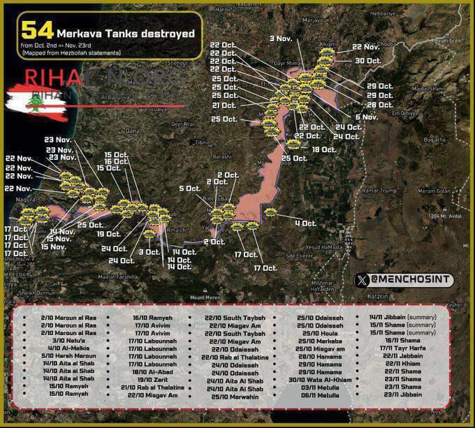 La mappa mostra i carri armati Merkava israeliani distrutti da Hezbollah usando missili anti-corazza nel periodo dal 2 ottobre al 23 novembre.