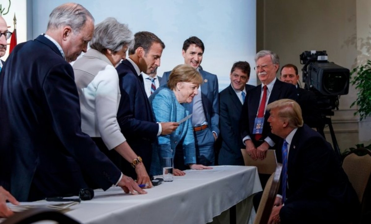 FAKE PHOTO Maurizio Blondet 10 Giugno 2018 0 Dal fotografo ufficiale di Angela Merkel, Jesco Denzel. Dal fotografo ufficale canadese del Vertice, Adam Scotti..