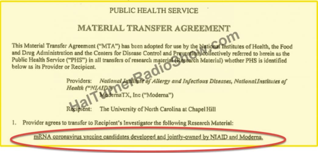 Nel documento rivelato da Hal Turner, il NIAID (cioè Fauci) si dichiara “comproprietario” e cosviluppatore del vaccino ModeRNA con la Casa Farmaceutica.