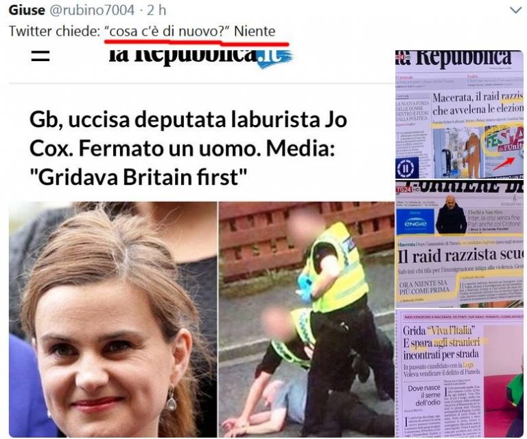 Questo espisodio ci ha fatto tornare alla mente l’omicidio di Jo Cox, la deputata laburista uccisa durante la campagna elettorale sul referendum per la Brexit, mentre era con la sua amica musulmana Fazila Aswat, la quale, a quel che sappiamo, non ha mai testimoniato che il killer avrebbe pronunciato le parole “Britain first”. “Omicidio Cox, chi sono i veri mandanti?”