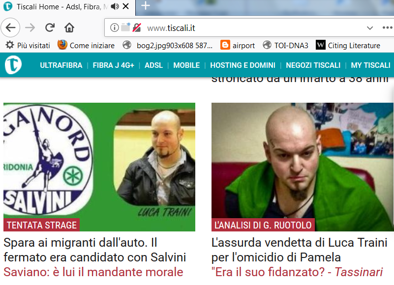 E invece a chi si fa il processo? Alla Lega. A Salvini. Gli strilli mediatici sono tutti per il pericolo fascista rappresentato da questo Luca Traini, “candidato della Lega”, “simpatizzante per Casa Pound e Forza Nuova”, che si fa prendere dopo essersi messo sulla spalle un tricolore e fatto il debito saluto fascista.
