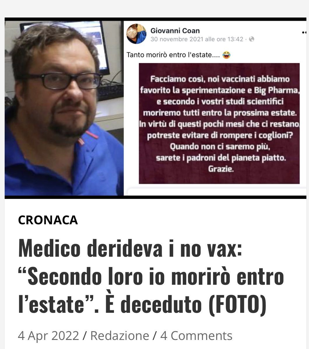 Stragi genocide di civili uccisi e storpiati per sempre hanno luogo in Italia decine di volte più frequenti che a Bucha. L’elenco dei morti per “malore” e dei campioni ciclisti o tennisti improvvisamente infartuati è troppo lunga per poterla mettere in un solo pezzo . Possiamo solo dare qualche esempio campionario.