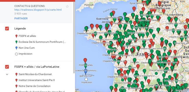 La mappa indica le località dove si tengono Messe in latino secondo il rito antico. I punti rossi indicano le Messe genericamente “lefevriane”, potenzialmente scismatiche; ma i punti verdi, assai più numerosi, mostrano le località dove si celebrano le Messe del tutto ortodosse, secondo il Motu Proprio Summorum Pontificum di Benedetto XVI. Evidentemente, la mappa risponde ad una esigenza pratica. Il parigino in viaggio ha bisogno di sapere se c’è una messa in latino a Besançon o ad Amiens, e in quale chiesa.