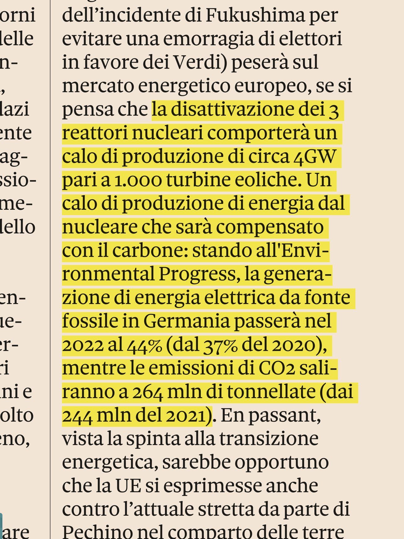 Berlino ha scelto questo momento (inverno) per chiudere tre centrali nucleari, e la scomparsa delle energia nucleare sarà compensata dal carbone: siccome la Germania è, apparentemente all’insaputa della Baerbock, un paese industriale, le industrie non possono fare a meno di energia ad alta intensità : quindi le centrali germaniche, che aumentano il consumo di carbone dal già enorme 37% al 44%. IL che farà aumentare le emissioni di CO2 nella quantità descritta da 24Ore, per cui il governo dovrà pagare le tariffe punitive decretate dalla UE.