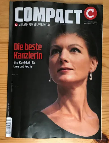 Di recente è apparsa sulla prima pagina del mensile Compact (“Rivista Sovranista”, il sottotitolo) portavoce non ufficiale dell’AfD. Nel suo ultimo numero il suo interessante volto appare accanto alla riga di copertina: “la migliore cancelliera – una candidata per la sinistra e la destra”.