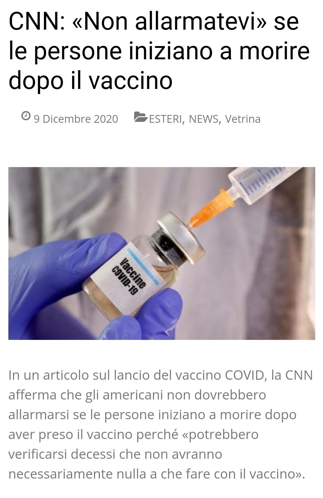Di fatto, in proporzione, già nella sperimentazione il vaccino di Pfizer ha ammazzato più del Covid da cui ci dovrebbe proteggere, che ha un tasso di letalità 0,qualcosa. Tant’è vero che la CNN esce con questo titolo