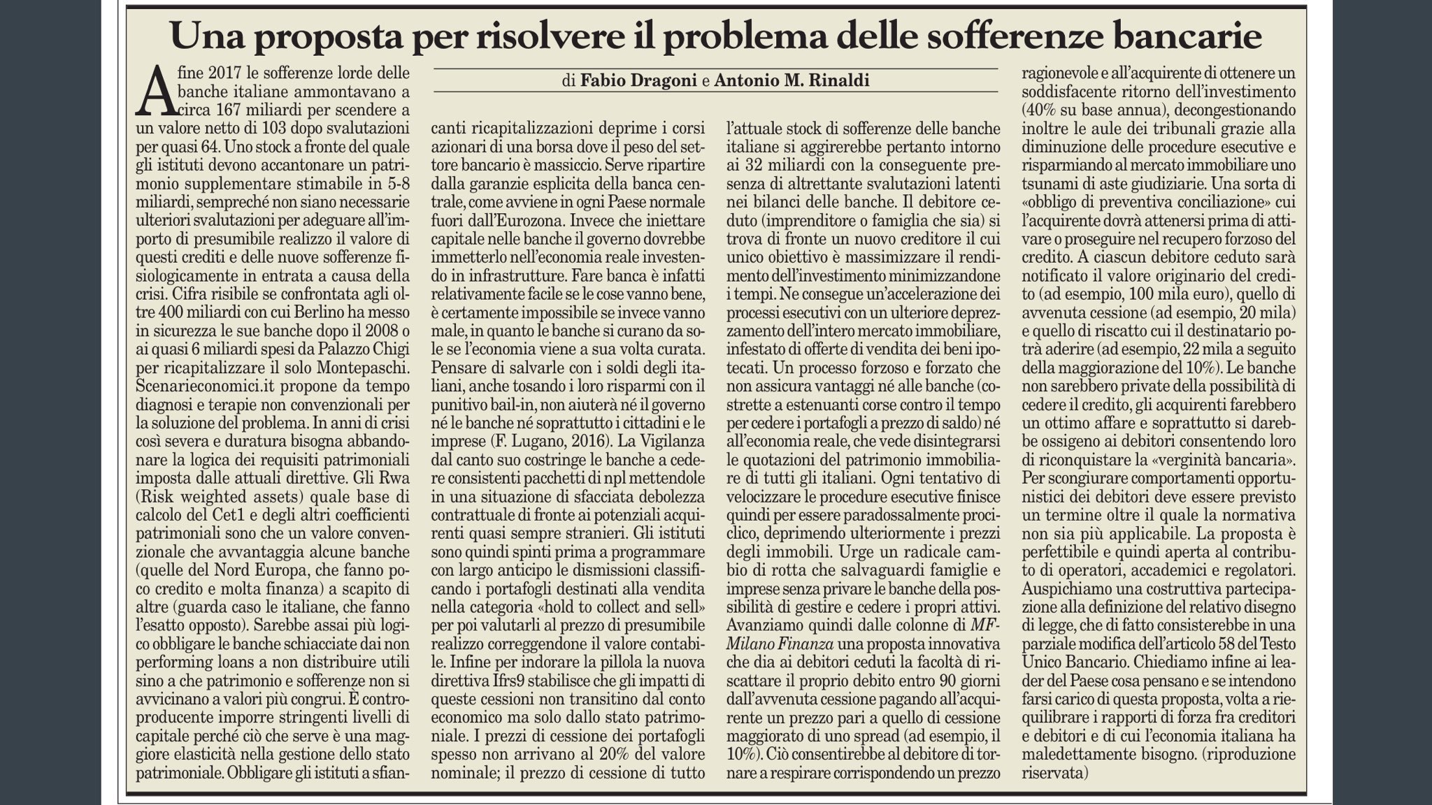 “Una tragedia silenziosa. Così redditizia che mi vado convincendo che le regole di Basilea, ufficialmente nate per tutelare i risparmiatori e di fatto responsabili del massacro di questi ultimi, siano state pensate esattamente per arrivare alla svendita dei crediti delle banche” (Franco Pavoni).