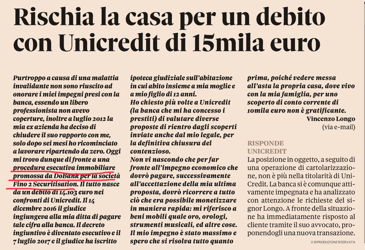 Commento: “Una tragedia è in corso nel nostro Paese. Chi ora richiede il pagamento di quel credito è un soggetto che l’ha comprato al 12,94% del nominale e vuole, legittimamente, ottenere rendimenti a doppia cifra. E qualcuno finisce per strada. Fermate questo scempio” (Giuseppe Liturri, commercialista)
