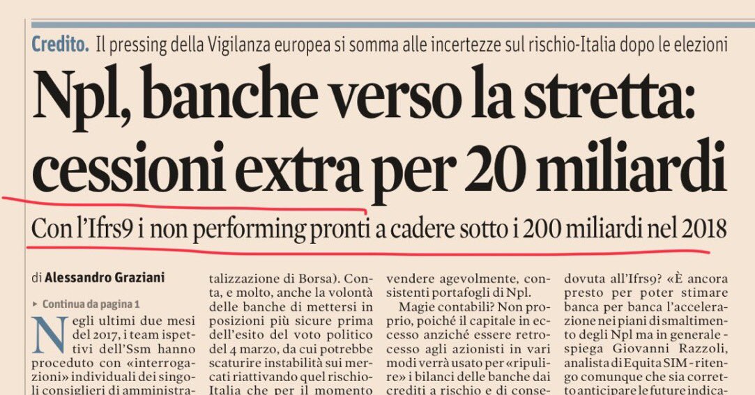 “Raccomandando di svalutare lo STOCK (non solo i nuovi flussi) di NPL in 7 anni, viene giù mezzo sistema bancario. Effetto pro-ciclico della Vigilanza BCE” (Giuseppe Liturri). Insomma Enria si conferma “un killer” (citaz. Musso) che poersegue l’obbiettivo tedesco: espellerci dall’euro schiacchiati, umiliati e spolpati di oro delle riserve Bkitalia, e risparmi italici.