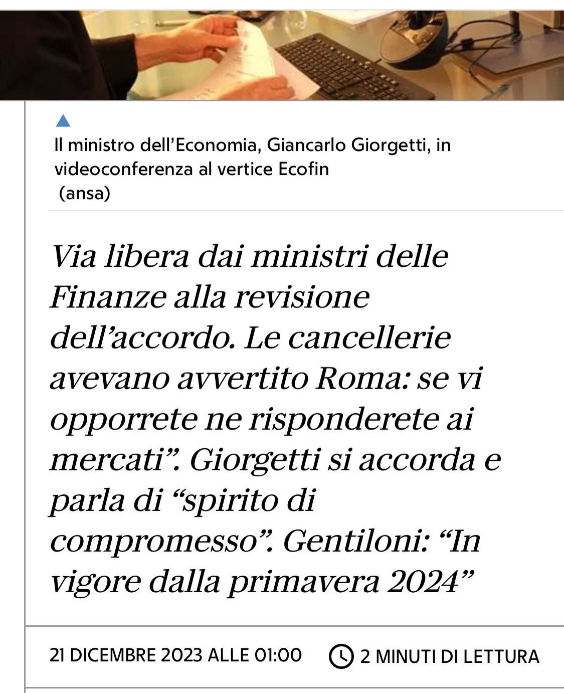 Il Governo ha accettato l’accordo raggiunto da Francia e Germania sul nuovo Patto «in uno spirito di compromesso», per usare le parole del Ministro dell’Economia, Giancarlo Giorgetti.