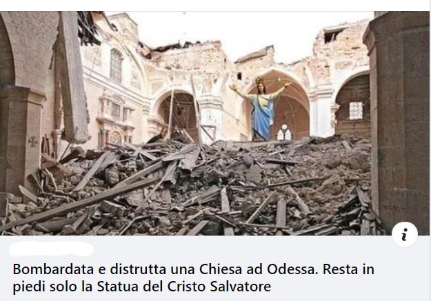A due giorni dalle celebrazioni per il 13esimo anniversario in ricordo delle 309 vittime del sisma, sui social diventa virale un articolo dal titolo “Bombardata e distrutta una Chiesa ad Odessa. Resta in piedi solo la Statua del Cristo Salvatore”, in cui viene raccontato, a proposito della guerra in corso in Ucraina, che “un missile ipersonico a cortoraggio con una potenza distruttiva devastante ha colpito una chiesa lasciandola interamente in macerie, completamente distrutta, ma è stata ritrovata intatta una statuetta del Salvatore Gesù sulle macerie completamente integra. E benedicente, come mostriamo nella foto”.