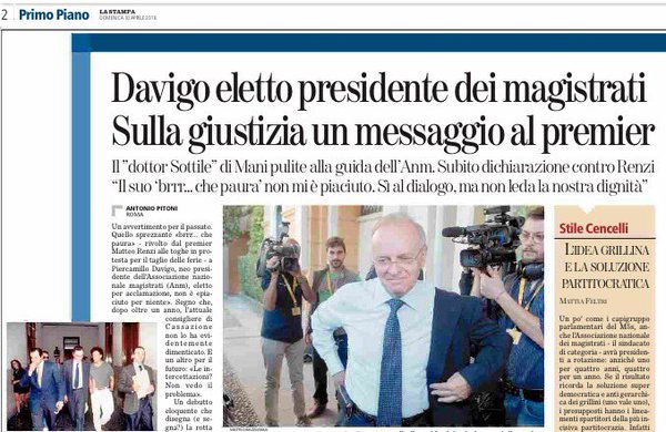 Come ho già detto, la “riforma” renziana del Senato può essere tutto tranne che perfetta; ma se viene bocciata quella, possiamo sognarci tutte le altre riforme della pubblica amministrazione per il prossimo secolo; ed è proprio e solo per questo che la casta giudiziaria è interamente mobilitata, affiancata da politici e giornali inqualificabili, a seppellirla: mettono al sicuo il loro stipendio, la loro inadempienza, i loro poteri indebiti che si sono conquistati con Mani Pulite.