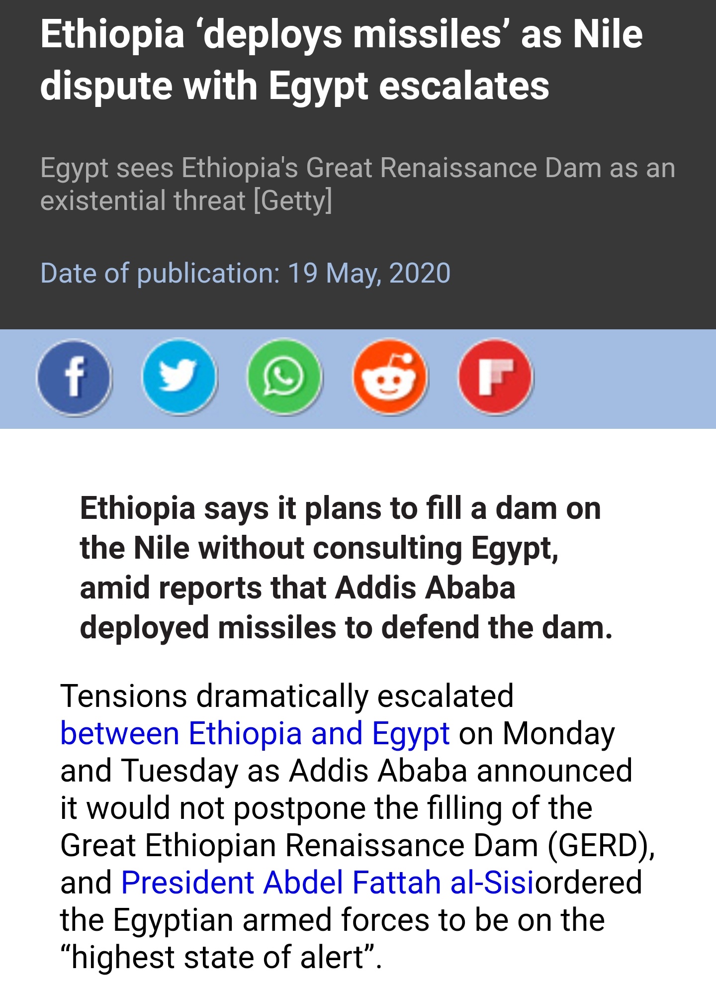 L’Egitto ha una gravissima crisi aperta con l’Etiopia: questa vuole riempire una diga sul Nilo senza consultare Il Cairo – quindi compromettendo le benefiche periodiche alluvioni – ed ha dispiegato missili per difendere la diga.