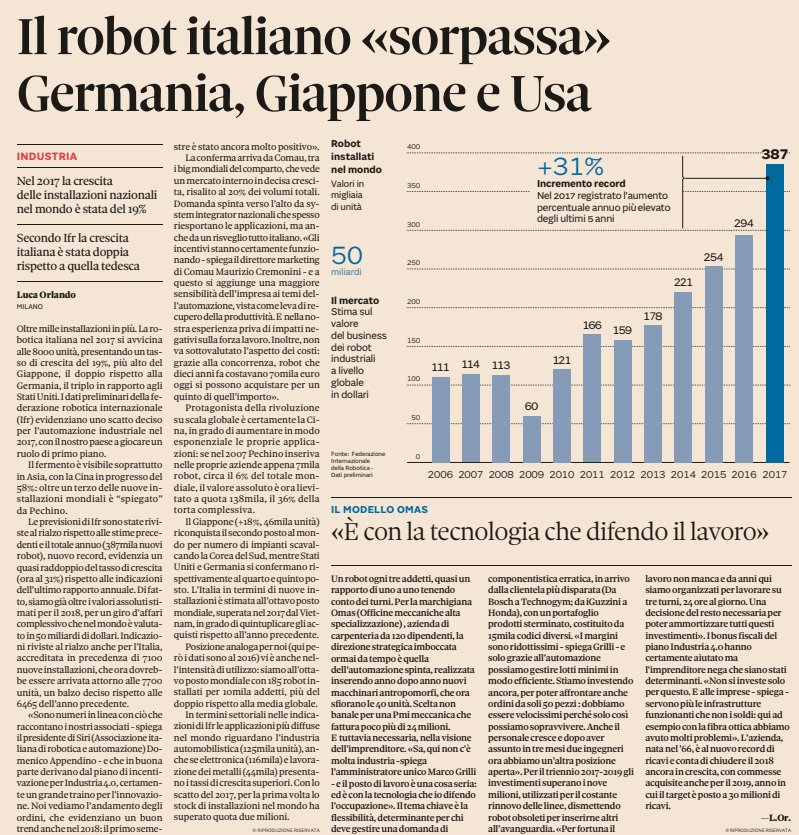 Il punto è che i giornalisti tv, cialtroni per lo più romaneschi, non hanno alcuna cultura industriale, ma in quanto romaneschi sono esperti di ristoranti. Mai gli viene in mente di fare un servizio su questa eccellenza mondiale italiana, l’industria dell’automazione (macchine che costruiscono macchine). Mai vi faranno inorgoglire, i cialtroni da pizzeria, che la robotica italiana riesce ad essere competitiva ed esportare pur esportando con una moneta sopravvalutata del 20-30 per cento; che supera il Giappone e gli Usa. Una forza eroica, contro le forze del caos, del settarismo e della stupidità irresponsabile che le si oppongono in Italia .