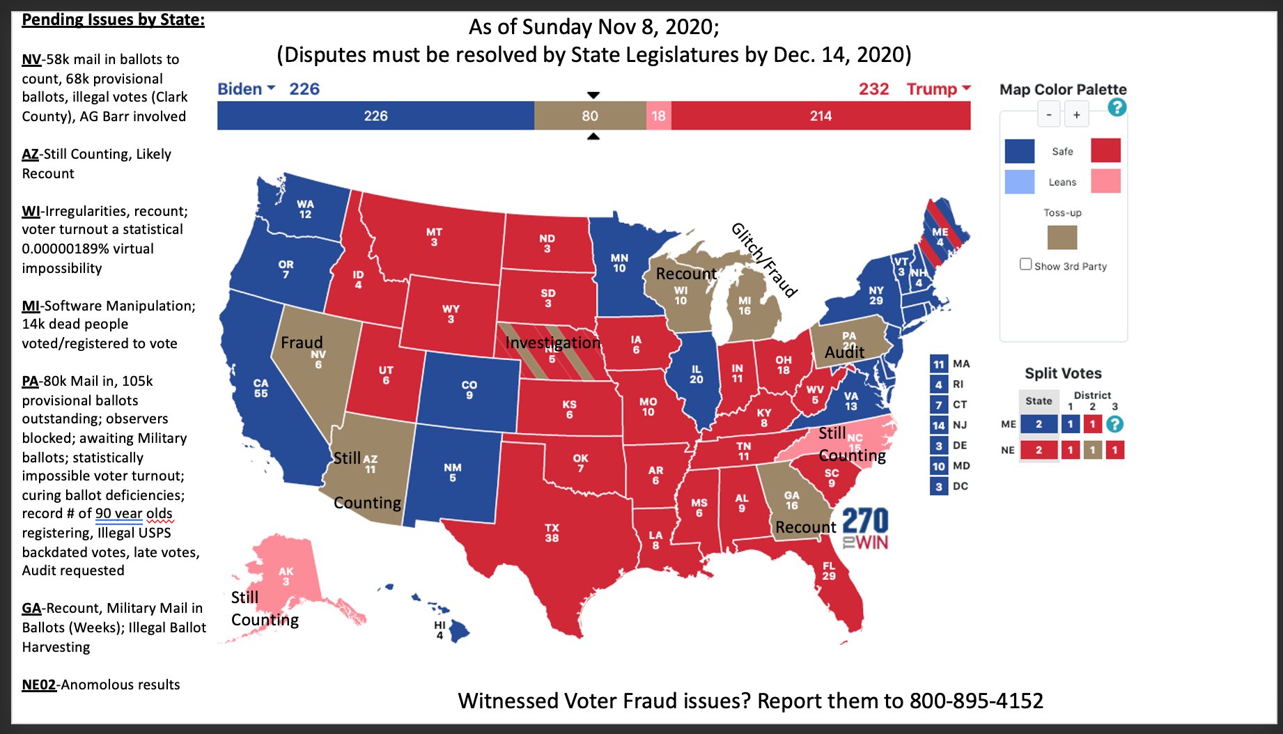 80 voti elettorali in 7 stati controversi. Tutte le controversie devono essere risolte da queste legislature statali entro il 14 dicembre indipendentemente da audit, riconteggi, azioni legali. 6 di quelle legislature sono la maggioranza Rs.