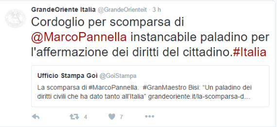 Direttamente dal profilo twitter ufficiale del Grande Oriente d’Italia giunge un “commosso saluto” a Marco Giacinto Pannella. Il Gran Maestro Stefano Bisi ha oggi ricordato l’amico Pannella con queste parole“Marco Pannella è stato soprattutto un grande uomo libero, uno spirito laico e coraggioso che si è speso per i diritti umani e civili. Le sue battaglie non saranno mai dimenticate anche da parte di noi liberi muratori. Penso che l’Italia gli debba molto e che avrebbe meritato per quello che ha fatto la carica di senatore a vita. Le sue parole e la forte stretta di mano che ci scambiammo lo scorso XX Settembre a Porta Pia rimarranno per me indelebili. Saluto commosso un guerriero e un paladino della libertà. I massoni hanno dedicato al defunto Pannella le note del “Il silenzio”, suonate settimana scorsa a Reggio Calabria  in onore dei massoni defunti e quindi, secondo i catechismi massonici, “passati all’oriente eterno”. Per noi Cattolici  dopo il giudizio particolare, l’anima, se è senza peccato e senza debito di pena, va in paradiso; se ha qualche peccato veniale o qualche debito di pena, va in purgatorio finchè abbia soddisfatto; se è in peccato mortale, qual ribelle inconvertibile a Dio va all’inferno. (Dal Catechismo della Dottrina Cattolica detto di San Pio X).