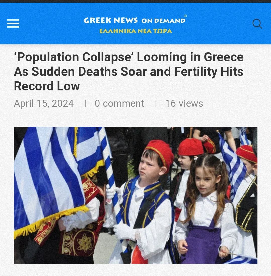 “Si prevede che la Grecia diventerà la prima nazione a subire un “collasso demografico”, poiché i decessi improvvisi e inaspettati continuano a salire in tutta la nazione, mentre i tassi di fertilità sono crollati a livelli inferiori a quelli che gli esperti avevano ritenuto possibili in precedenza.”