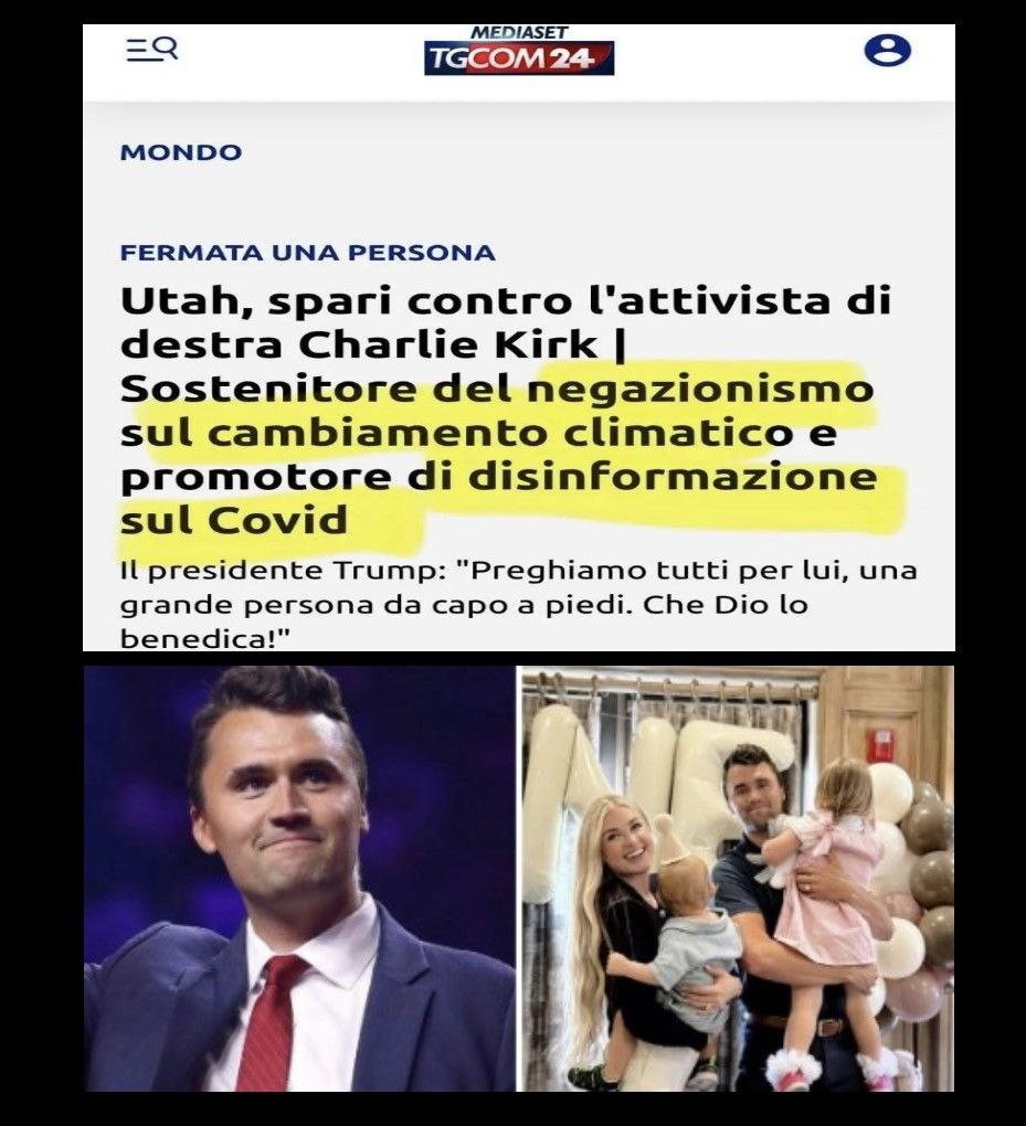 Nella foto sopra, come le agenzie di stampa prezzolate riportano la notizia dell’uccisone di Charlie Kirk, quasi fosse da accogliere con gioia, perché non allineato al pensiero unico cui spinge il mainstream.