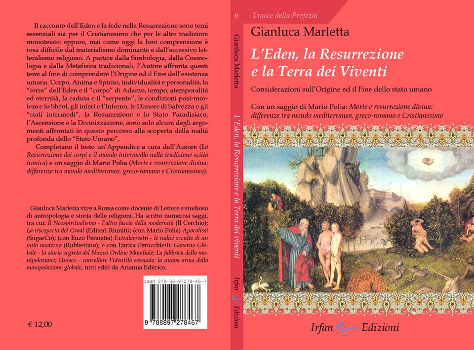 Gianluca Marletta, nel suo saggio “, L’Eden, la Resurrezione e la Terra dei Viventi – Considerazioni sull’Origine e il Fine dell’essere umano” (Irfan Edizioni, 130 pagine, 12 euro) ha recuperato nella sua affascinante complessità l’integralità della conoscenze di cui la Chiesa è tuttora depositaria, magari a sua insaputa. Lo ha fatto ricorrendo spesso a tradizioni di altre culture, con ampie citazioni di René Guénon (che piaccia o no, è un riferimento obbligato in questa sfera delle religioni comparate), il che lo espone, credo, ad accuse di gnosticismo o esoterismo. Errore: le conoscenze sul destino ulteriore dell’uomo, prima della sua attuale estrema materializzazione, erano un patrimonio comune e perenne di tutte le culture tradizionali; espresse in linguaggi diversi ma in simboli spesso convergenti, conoscenze “di derivazione germanica, celtica e orientale” diventano utili e persino necessarie per illuminare e recuperare le dottrine “perfettamente cristiane” che continuano ad esistere, ormai mal comprese, nel cattolicesimo e che nei suoi testi sono ben esplicite – purchè li si sappia leggere con l’occhio spirituale.