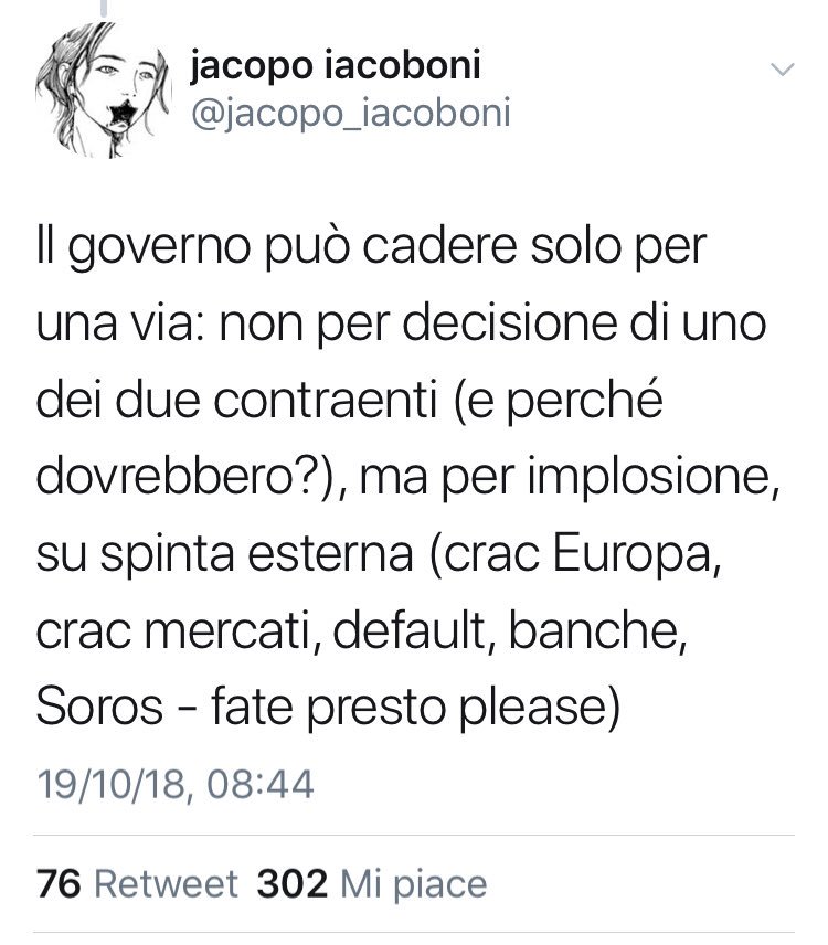 E’ qualcosa a cui Renzi allude da mesi: “Presto toccherà di nuovo a noi», annuncia in una diretta Facebook ad agosto: «A settembre, ottobre vedrete che ci sarà da divertirsi», perché “i mercati” attaccheranno il governo giallo—verde. Cosa che ha ripetuto, con i toni violenti di un dittatore prossimo venturo, alla Leopolda: “ I mercati balleranno quando arriverà il parere della Commissione europea sulla manovra e chi ne pagherà le conseguenze saranno quelli che devono prendere un mutuo o un fido. Fermatevi per l’amor di Dio finché siete in tempo, state sfasciando i conti e non state mantendendo le promesse elettorali”. Ha promesso agli opposiTori “il patibolo”.