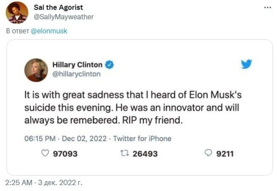 “E’ con grande tristezza che ho sentito del suicidio di Elon Musk stasera. Era un innovatore e sarà ricordato sempre. Riposa in pace amico mio”
