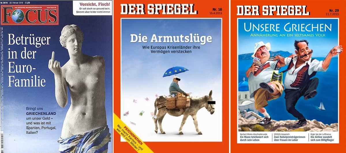 Qui sotto, la solidarietà che i media tedeschi hanno mostrato verso la Grecia nel 2013. Focus, mostra il dito indice ai “truffatori della famiglia euro”. Spiegel titola: “la menzogna della povertà – Come la Grecia nasconde la sua ricchezza per rubare alla Germania”. Nel 2015: “I nostri greci”, immagine razzista di un greco che balla con un turista tedesco,preccupato dei suoi soldi (lui glieli ruberà).