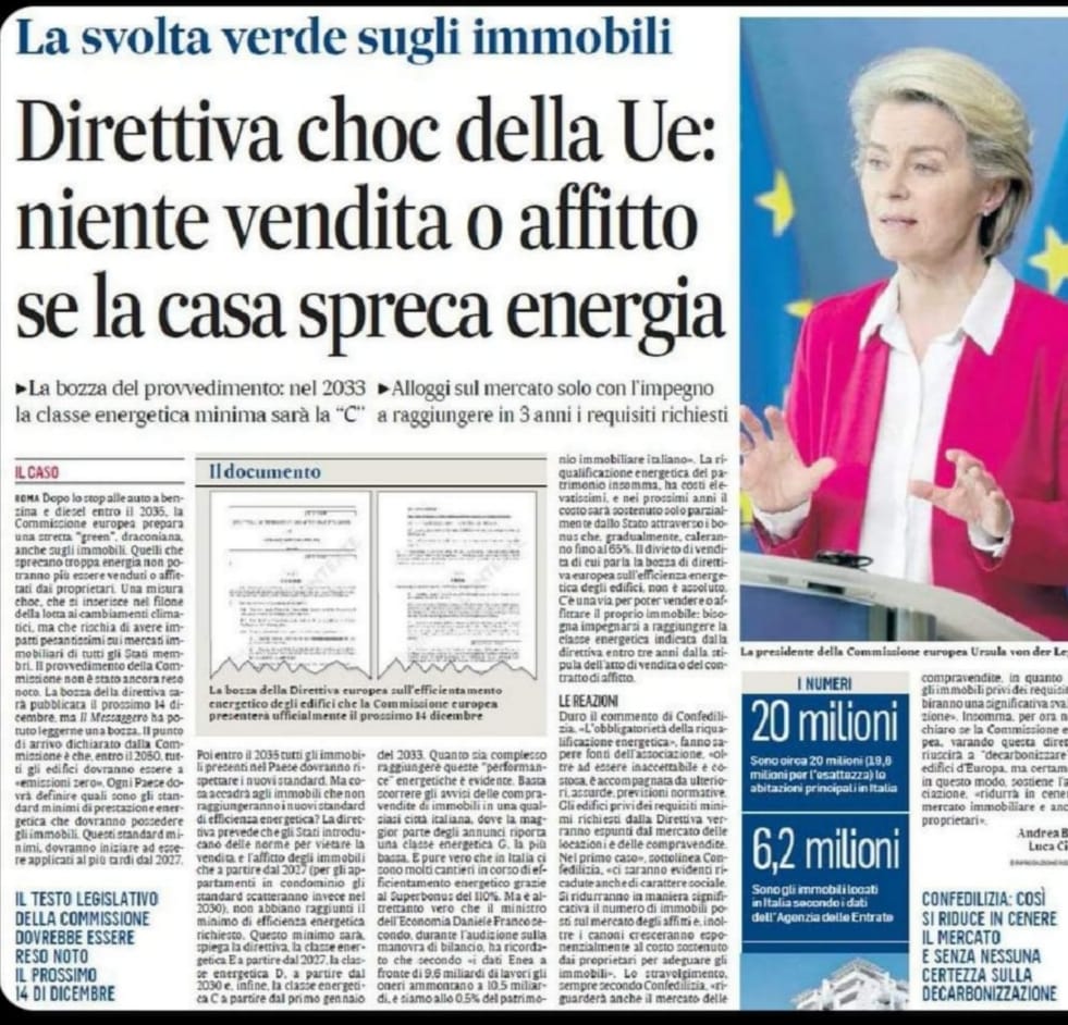 La guerra alla proprietà privata avanza e la morsa sta per stringersi attorno a quei beni frutto di lavoro, risparmio e sacrifici, prima tra tutti la casa. Da un lato continueranno a tagliare il potere d’acquisto degli stipendi, dei salari attraverso manovre che riaccendono l’inflazione, quali gli aumenti della bolletta energetica per la gioia di Greta e dei suoi seguaci, dei prezzi al consumo, dei servizi, dall’altra con l’introduzione di alcuni parametri legati ai temi “green” del risparmio energetico, del contenimento delle emissioni di Co2 otterranno una svalutazione esponenziale delle abitazioni più vecchie, rendendole addirittura non più idonee ai parametri richiesti dal mercato a meno di costosi lavori di adeguamento.