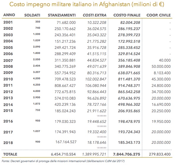 Tralasciando tutti questi costi indiretti, il costo ufficiale della partecipazione alle missioni militari in Afghanistan a partire dal novembre 2001 (Enduring Freedom fino al 2006, ISAF fino 2014, Resolute Support dal 2015) è di 6,5 miliardi di euro, vale a dire oltre un milione di euro al giorno in media. Agli stanziamenti vanno aggiunti tutti i costi extra delle missioni, e cioè l’esborso di 480 milioni a sostegno delle forze armate afgane (120 milioni l’anno a partire dal 2015) e circa 900 milioni di spese aggiuntive relative al trasporto truppe, mezzi e materiali da e per l’Italia, alla costruzione di basi e altre infrastrutture militari in teatro, al supporto operativo della Task Force Air (Emirati, Qatar e Bahrein) e degli ufficiali di collegamento distaccati presso Comando Centrale USA di Tampa, Florida, al supporto d’intelligence degli agenti AISE, della protezione attiva e passiva delle basi, al supporto sanitario del personale della Croce Rossa Italiana, alla protezione delle sedi diplomatiche nazionali e alle attività umanitarie militari strumentali (CIMIC, ovvero “attività a immediato impatto sulla dimensione civile, volti ad acquisite, mantenere, incrementare il consenso nei confermi del contingente militare nazionale”). Si arriva così a oltre 7,8 miliardi in 16 anni, a fronte di 280 milioni investiti in iniziative di cooperazione civile.