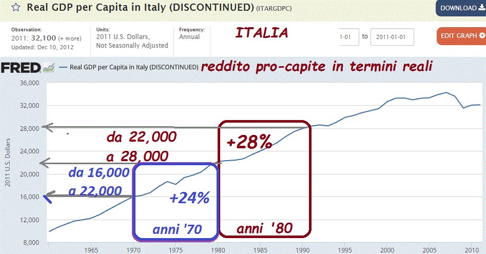 “Negli anni ’70 con inflazione media sopra il 10% il reddito reale (al NETTO DELL’INFLAZIONE) è cresciuto del 24% … controllare per credere… negli ultimi 10 anni invece, con inflazione all’1%, è calato del -.8% L‘inflazione bassa favorisce solo la rendita finanziaria