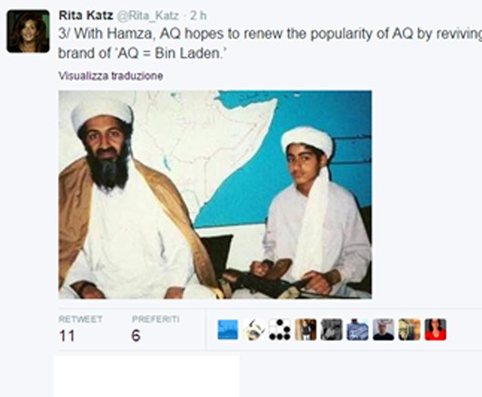 Ecco appunto. La vera notizia, la nostra valorosa agenzia di stampa l’ha bucata. Ed è questa: uno dei figli di Bin Laden ha finalmente trovato lavoro in America. E’ alle dipendenze di Rita Katz, la fondatrice ebraica del ben noto SITE, che ha diffuso tutti i più clamorosi video di Osama ed ha messo gli occhi su questa nuova promessa del terrorismo islamico -a dire la verità non da ora.