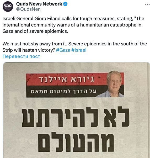 “Non dobbiamo assolutamente accettare la narrativa che ci ‘permette’ di combattere solo i militanti di Hamas invece di fare la cosa giusta, combattere l’intero sistema, perché è il collasso civile che accelererà la fine della guerra ,” ha scritto il ministro su internet. ♦️Gli israeliani cinicamente compiono un genocidio e lo rivendicano.