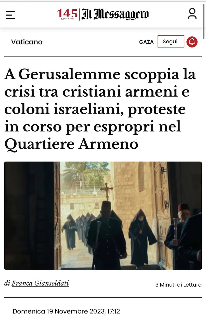 A Gerusalemme, i coloni israeliani stanno espropriando le proprietà dei cristiani armeni: il quartiere armeno ha origine nel IV secolo.