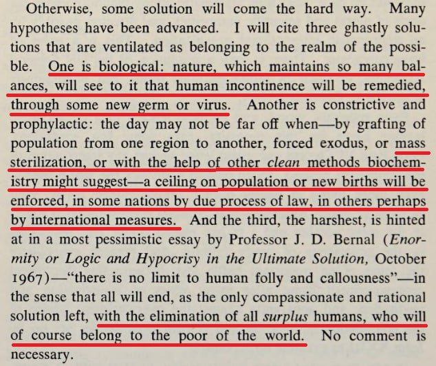 Il fondatore del Club di Roma, Aurelio Peccei, dove sono state elaborate le strategie d’ingegneria sociale che oggi vediamo pienamente dispiegate, nel suo libro “Verso l’abisso” (1970) fornisce tre “soluzioni” al problema del “surplus umano” nel 1969: