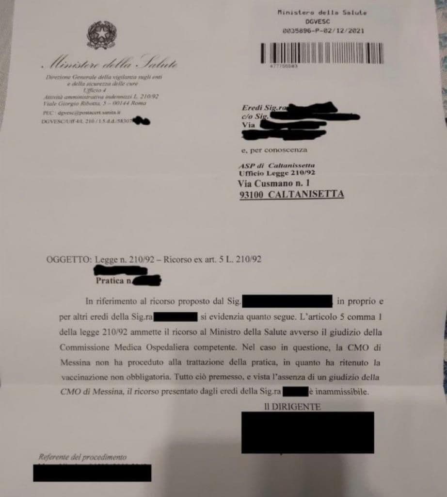 Si legge nel Decreto del Ministero della Salute notificato in Sicilia: “Nel caso in questione, la CMO (Commissione Medico Ospedaliera di prima istanza) di Messina non ha proceduto alla trattazione della pratica, in quanto ha ritenuto la vaccinazione non obbligatoria. Tutto ciò premesso, e vista l’assenza di un giudizio della CMO di Messina, il ricorso presentato dagli eredi della Sig.ra xxxx è inammissibile”.