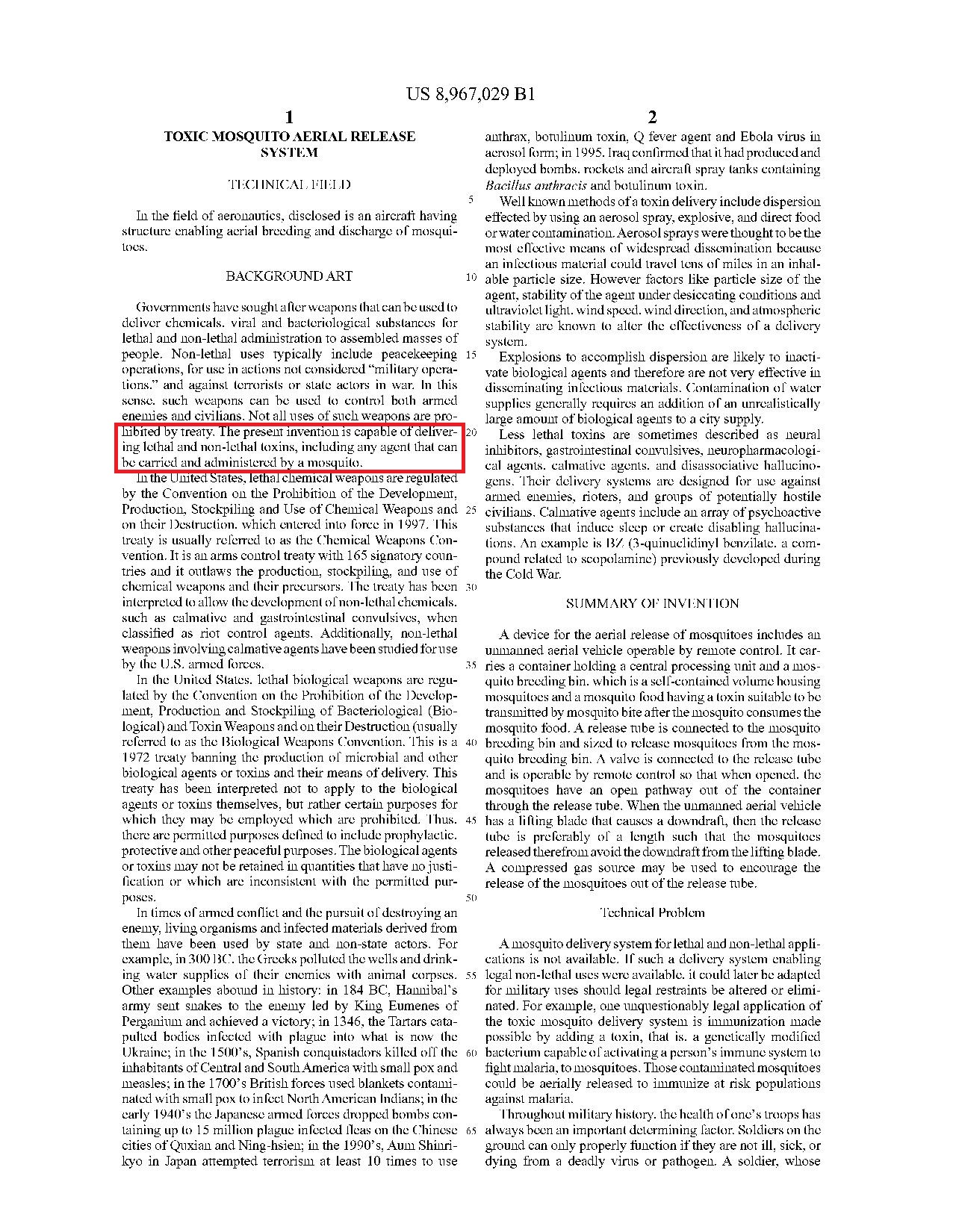 Tali timori non sono infondati, considerando un recente brevetto statunitense per un sistema di rilascio di Toxic Mosquito Aerial , concesso dall’Ufficio brevetti e marchi degli Stati Uniti nel 2014. L’invenzione include un drone che può rilasciare zanzare infette”.