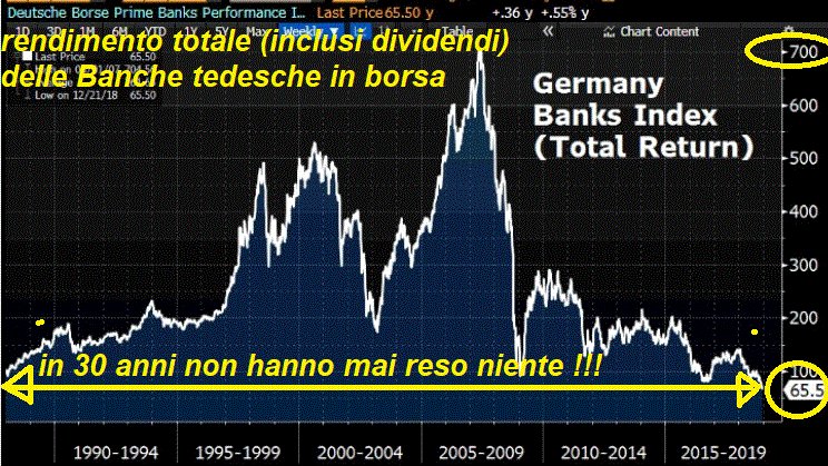 E, per finire con Zibordi: “IN GERMANIA LE BANCHE HANNO PERSO (inclusi dividendi !) IL 90% IN BORSA DAL 2007 E NON HANNO MAI RESO NIENTE NEGLI ULTIMI 30 ANNI”.