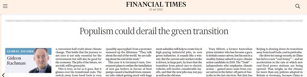 Questo è il titolo allarmato che Gideon Rachman (j), la Grande Firma Suprema e dispensatore delle direttive ideologiche fondamentali del Financial Times, che dispensa le Tavole della Legge del liberismo globale, dedica alla battuta d’arresto che il premier Sunak ha dovuto dare alle sue durissime disposizioni con cui obbligava i cittadini ad abolire di fatto i combustibili “fossili” nelle loro vite, vietando le auto diesel e a benzina entro pochi anni e obbligando a sostituire le caldaie del riscaldamento domestico, e la riduzione drastica fino a nulla della carne e formaggi, e un futuro di pale eoliche e pannelli solari, – l’articolo o conferma (se e ne fosse bisogno) che la “transizione green”.