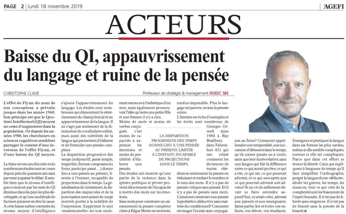 Il Quoziente d’Intelligenza (QI) medio della popolazione mondiale è in continuo aumento (effetto Flynn). Questo almeno dal secondo dopoguerra fino alla fine degli anni 90. Da allora il QI è invece in diminuzione… È l’inversione dell’Effetto Flynn. La tesi è ancora discussa e molti studi sono in corso da anni senza riuscire a placare il dibattito. Sembra che il livello d’intelligenza misurato dai test diminuisca nei Paesi più sviluppati. Molte possono essere le cause di questo fenomeno. Una di queste potrebbe essere l’impoverimento del linguaggio. Diversi studi dimostrano infatti la diminuzione della conoscenza lessicale e l’impoverimento della lingua: non si tratta solo della riduzione del vocabolario utilizzato, ma anche delle sottigliezze linguistiche che permettono di elaborare e formulare un pensiero complesso.La graduale scomparsa dei tempi (congiuntivo, imperfetto, forme composte del futuro, participio passato) dà luogo a un pensiero quasi sempre al presente, limitato al momento: incapace di proiezioni nel tempo. La semplificazione dei tutorial, la scomparsa delle maiuscole e della punteggiatura sono esempi di «colpi mortali» alla precisione e alla varietà dell’espressione. Solo un esempio: eliminare la parola «signorina» (ormai desueta) non vuol dire solo rinunciare all’estetica di una parola, ma anche promuovere involontariamente l’idea che tra una bambina e una donna non ci siano fasi intermedie.